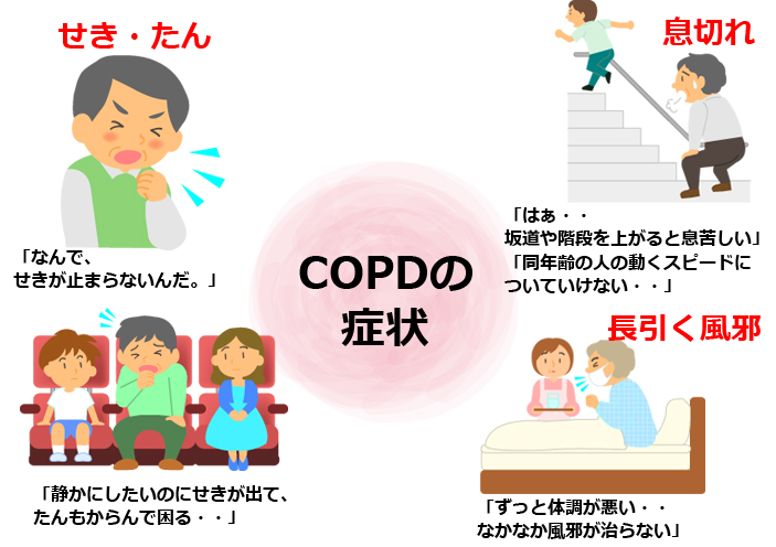 早足や坂道で息切れを感じたり、咳がなかなか止まらなかったり、痰がからんで仕方がないという症状が特徴的です。